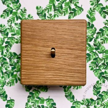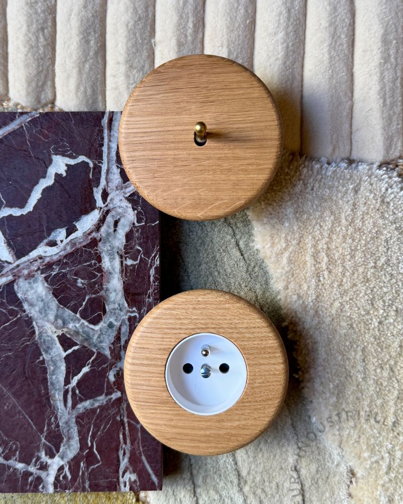 Poser la main sur un interrupteur en frêne ou en chêne, ce n’est pas seulement “allumer la lumière”. C’est sentir le veinage, la chaleur de la matière, l’irrégularité naturelle du bois. Chaque pièce est unique, comme un meuble ou un parquet.