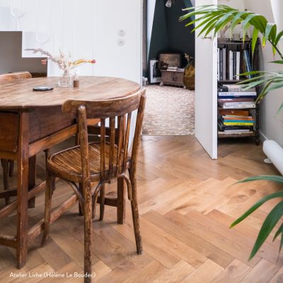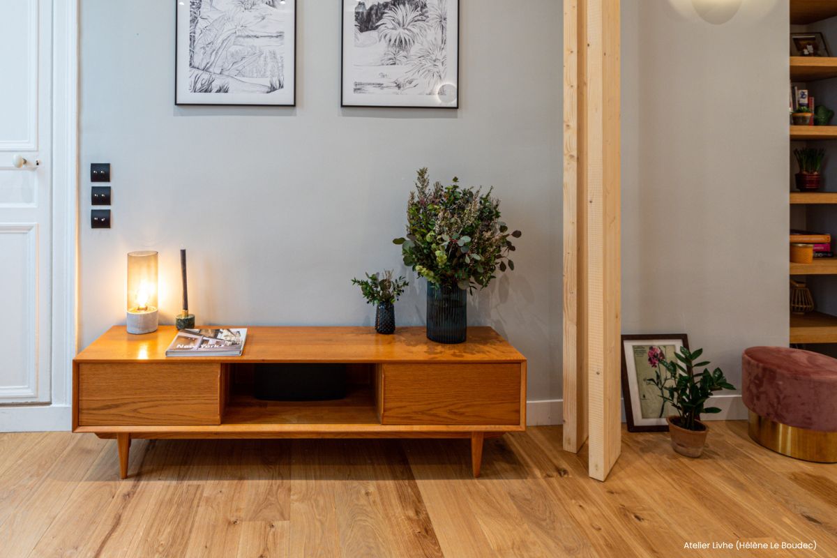 Plus affirmé, le chêne foncé façon wengé apporte une touche sophistiquée. Il est idéal dans des intérieurs graphiques, feutrés ou contrastés, où le bois sombre se marie au marbre, au laiton ou à des couleurs intenses.