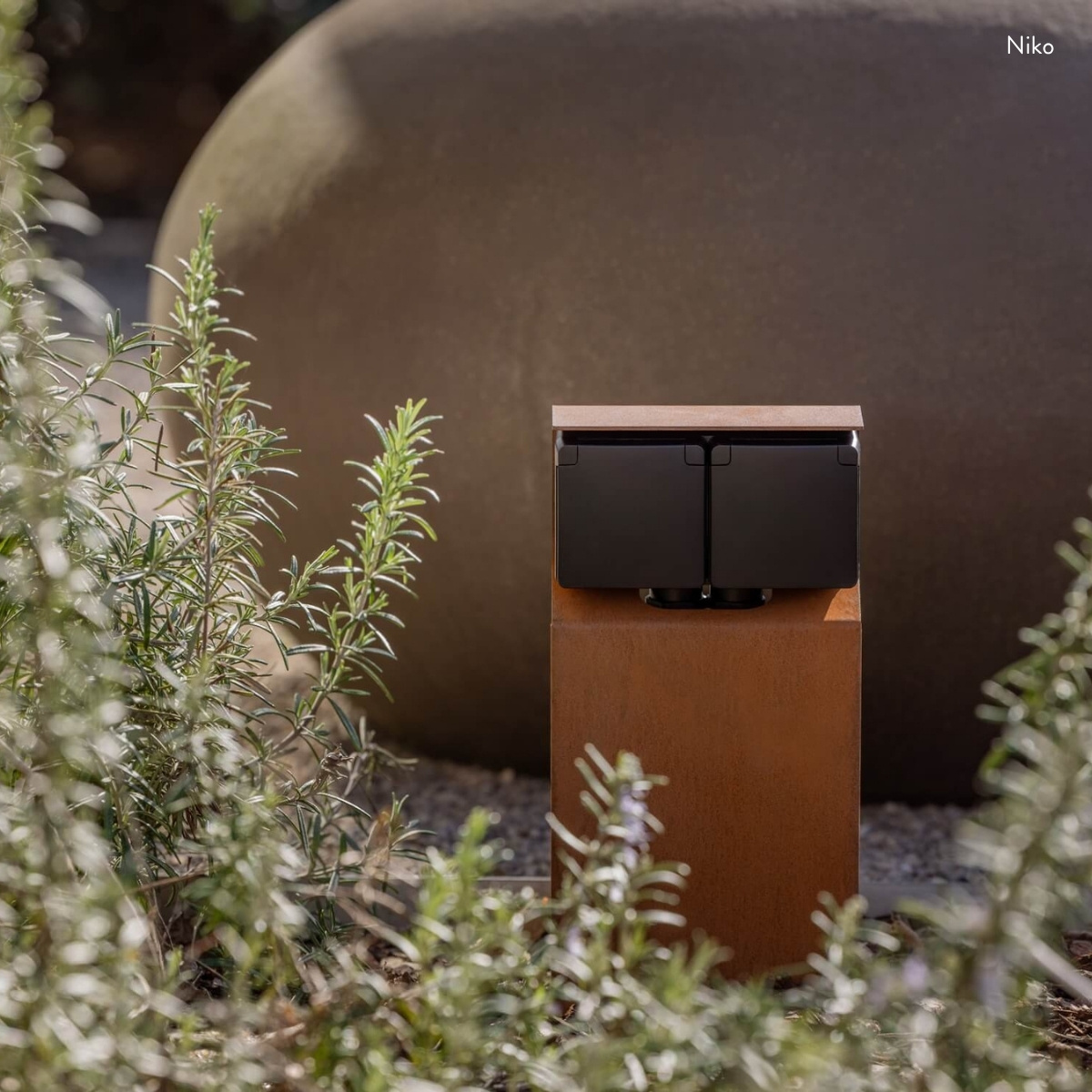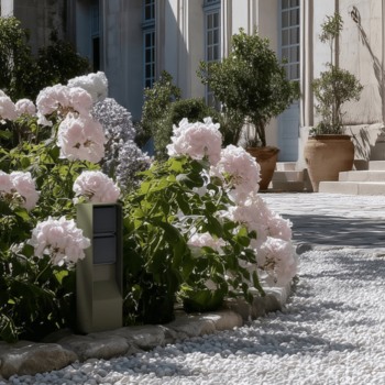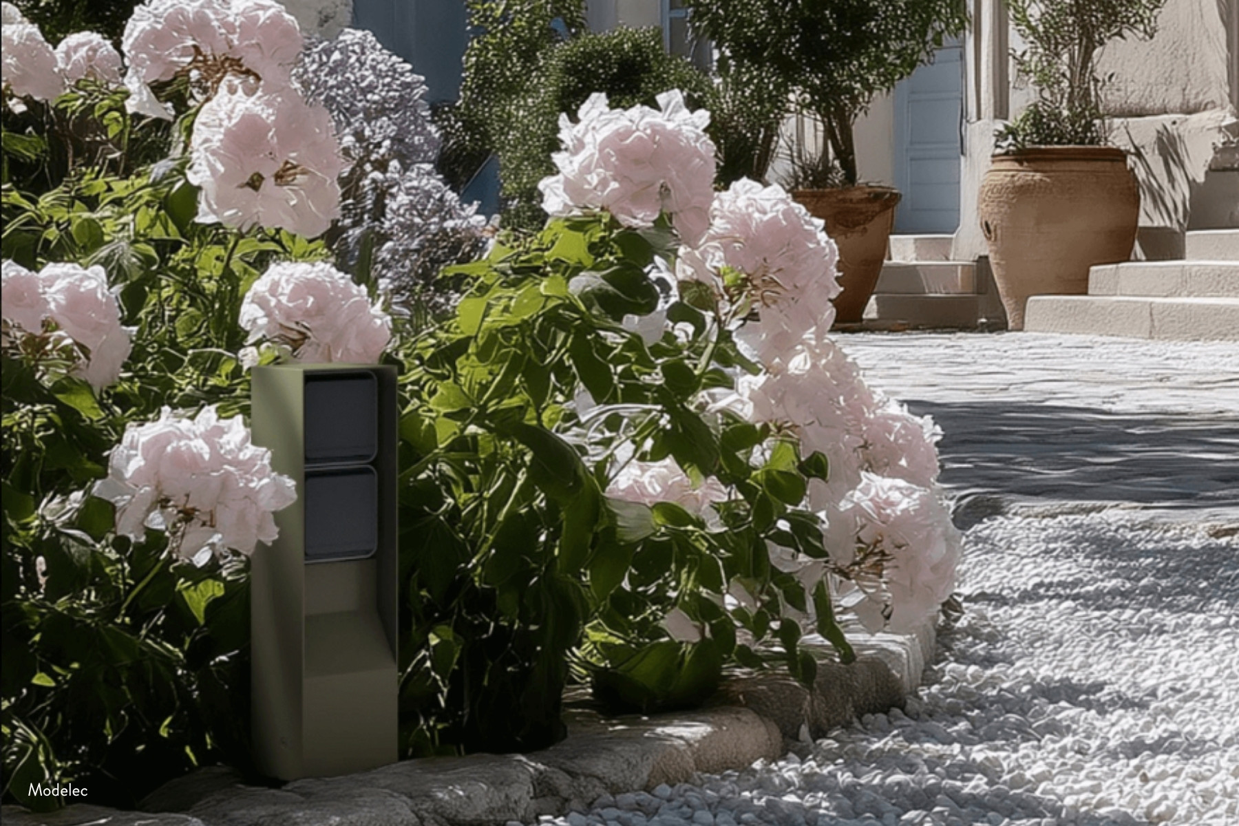 Avec ses lignes élégantes et ses finitions comme l’acier corten, le vert sauge ou le noir, elle devient une composante à part entière du décor. En bordure d’allée, la borne se révèle aussi très utile pour brancher du matériel de jardinage. Certains modèles peuvent être équipés d’une prise adaptée à la recharge lente d’un véhicule électrique.