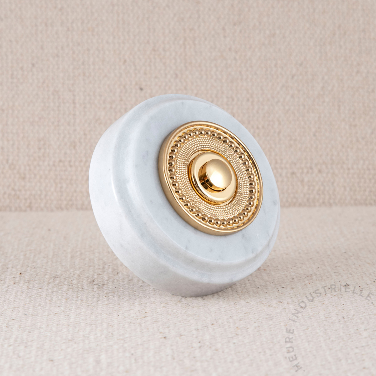 MARBRE BLANC ROND 75X20mm BOUTON ET COLLERETTE PERLEE OR